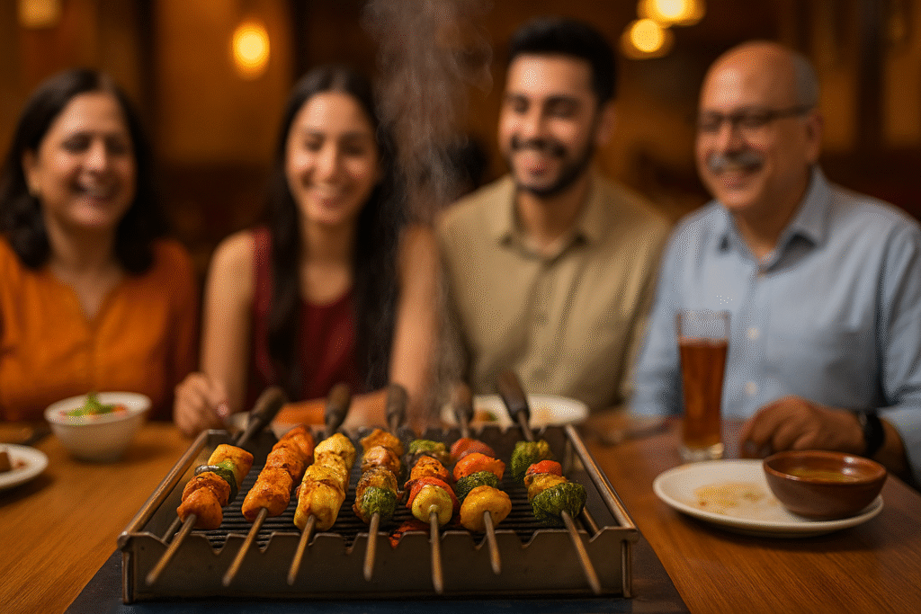 Signature experience: Fast first plates on the grill, a lively rhythm of veg and non-veg skewers, and staff trained for birthdays and team lunches.