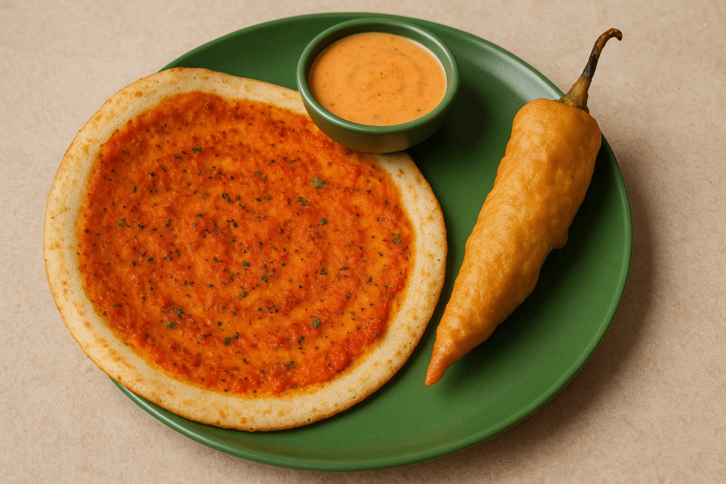 Karam DosaDosa with red spice pasteMedium-HighMirapakaya bajjiBreakfast/Tiffin